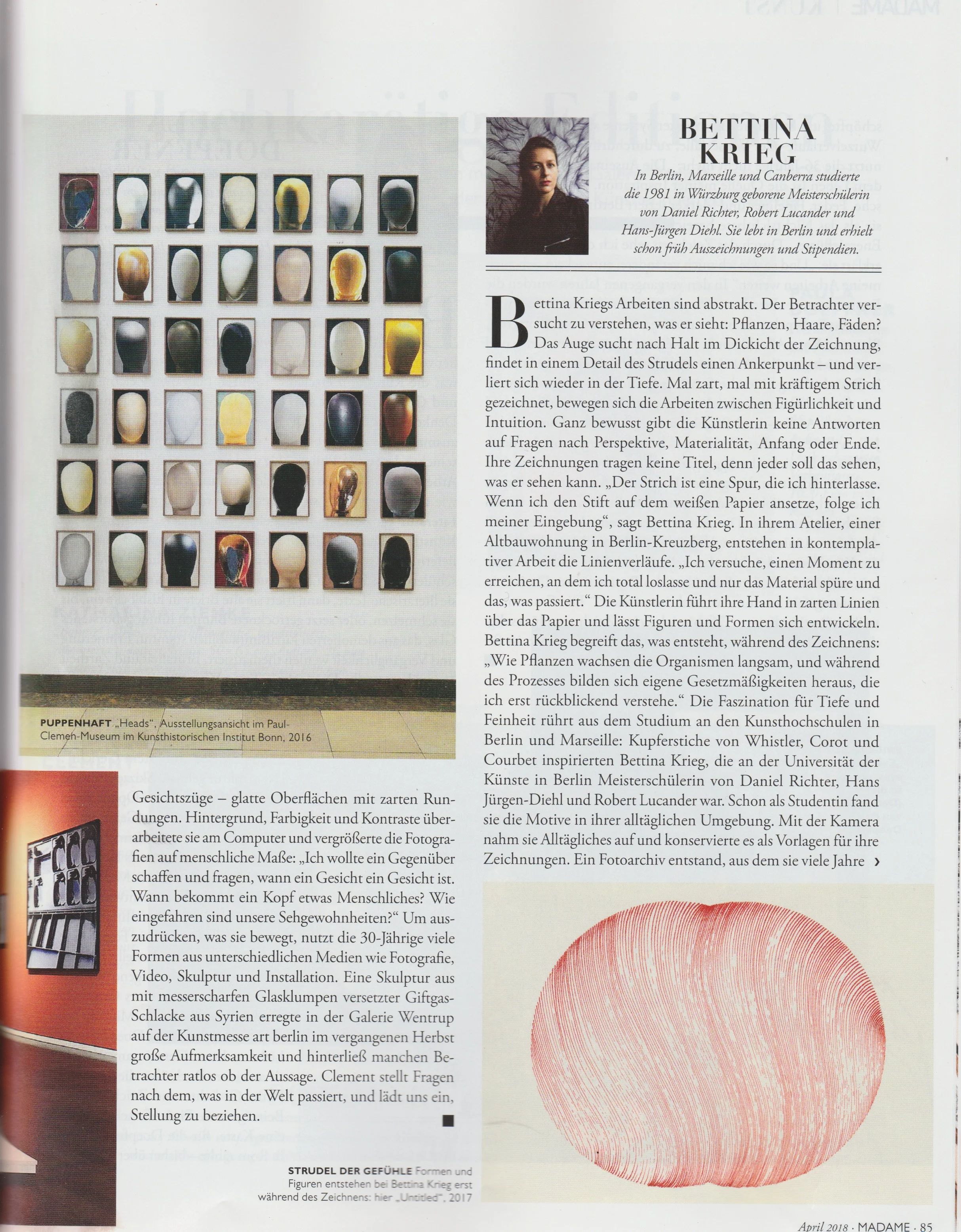 Kulturwissenschaftlerin und Autorin LISA SINTERMANN: “An einem Donnerstagmorgen treffe ich die Künstlerin Bettina Krieg. Als ich ihr Atelier betrete, atme ich auf. Keine Spur mehr von der Hektik der Urbanstrasse, die mich eben noch ergriffen hatte. Es duftet nach frischem Kaffee, Räucherwerk und Papierbögen. An den Wänden des hintersten Raumes hängen die Zeichnungen, an denen sie gerade arbeitet. Über die Blätter scheinen sich feine Linien wie die Musik zu bewegen, die aus dem Nebenzimmer ertönt. Lange, ewig könnte ich mich in die Zeichnungen hineinfallen lassen. Sie haben eine ungeheure Sogkraft und führen doch nirgendwohin…”